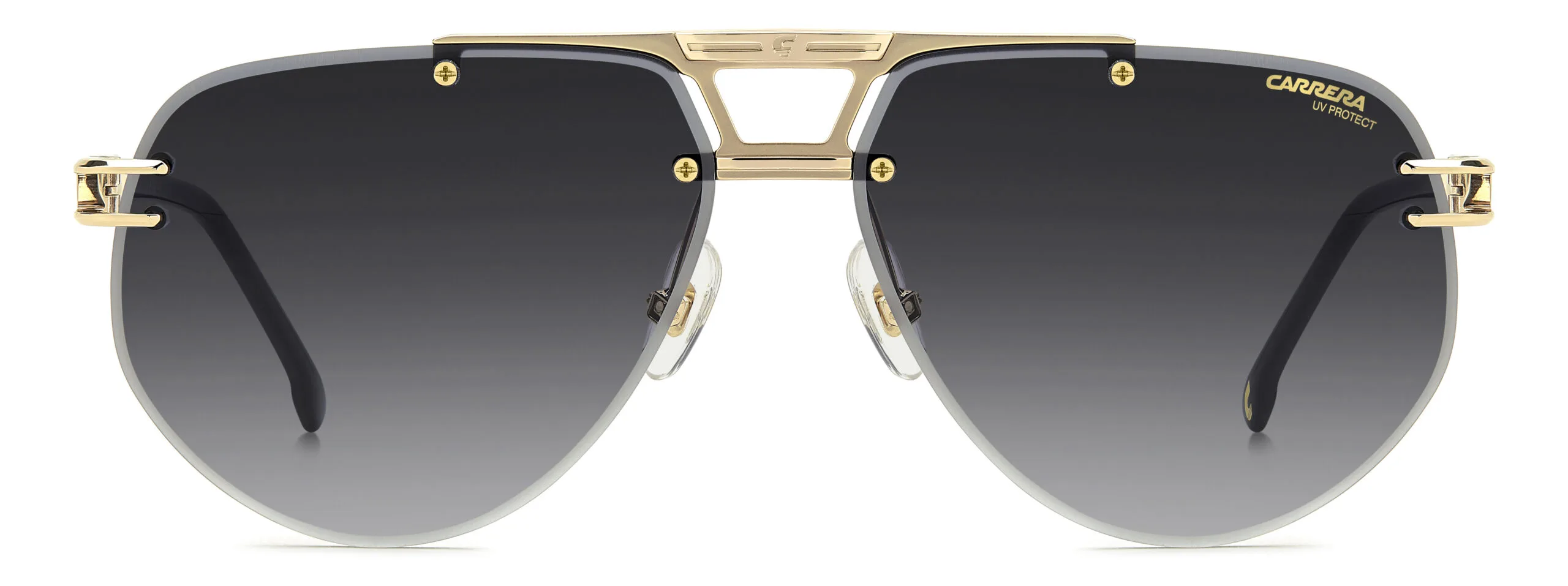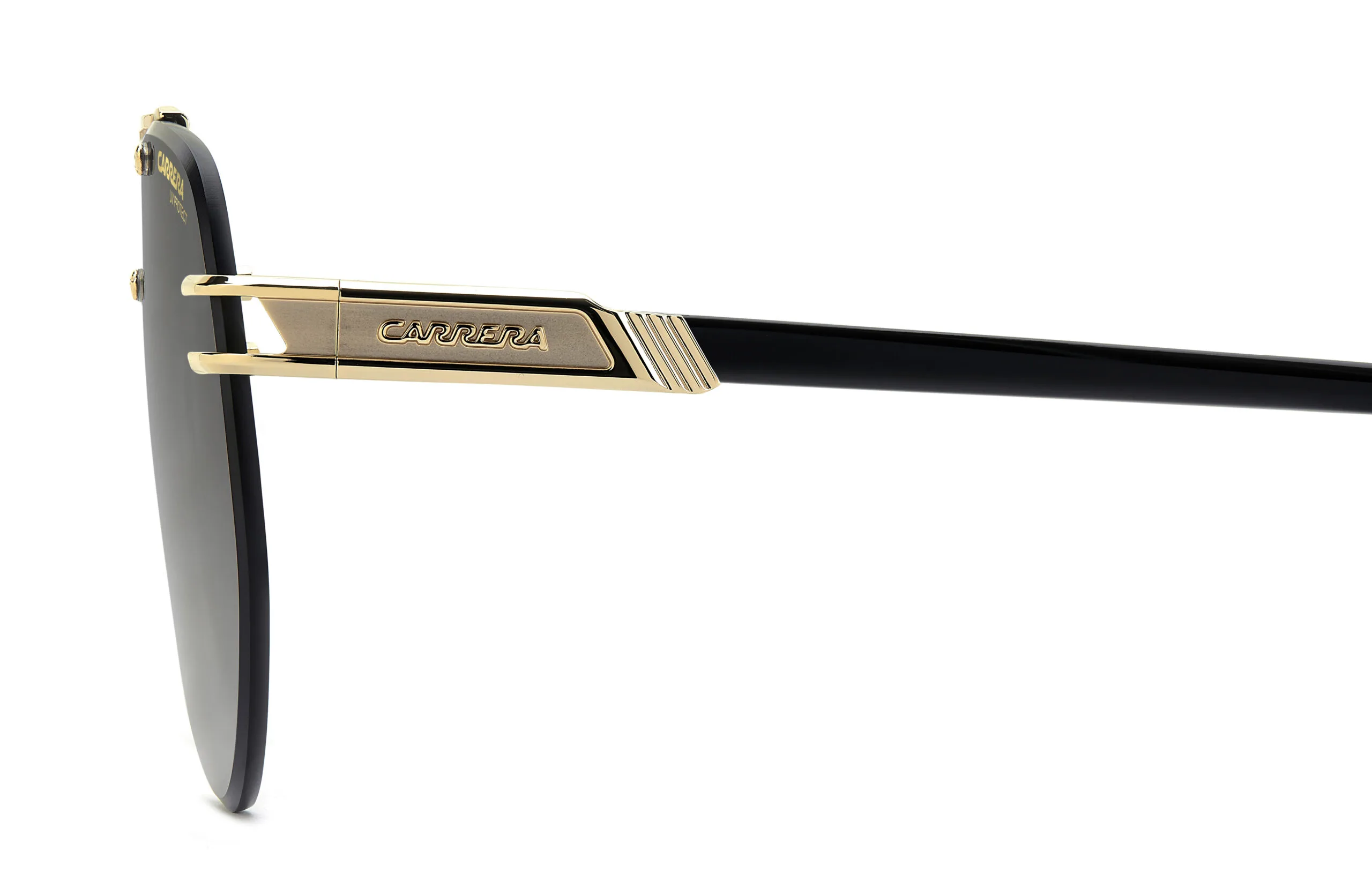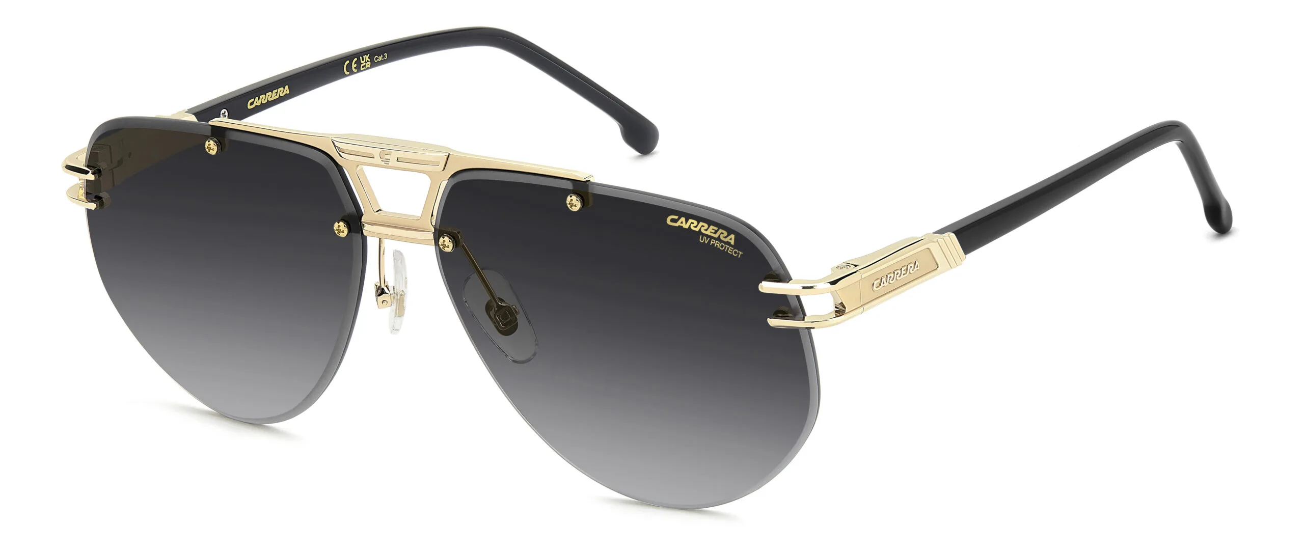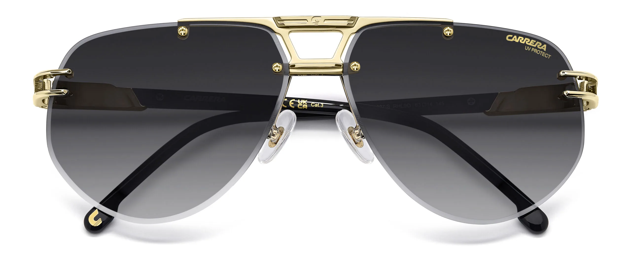 Carrera imzalı CA 1087/S/US, dikdörtgen çerçeve yapısı ve altın siyah rengiyle sezonun gözdesi olmaya aday. Metal malzeme kalitesi ve Koyu Gri Degrade cam teknolojisiyle hem şık hem de işlevsel bir seçim. Ekartman: 63 mm.