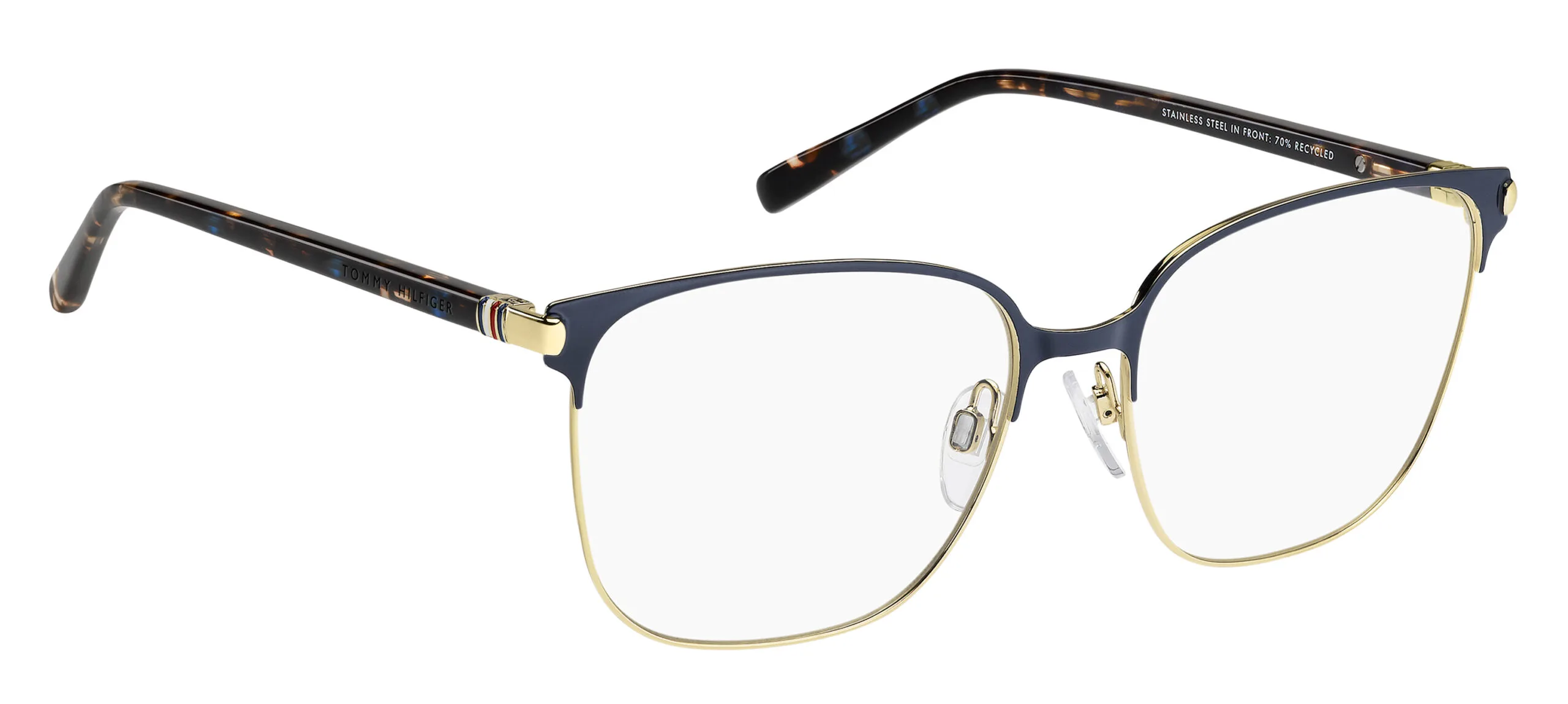 Tommy Hilfiger TH 2351, reçeteli kullanım için tasarlanmış mavi altın renkli metal çerçevesiyle günlük konforu ön planda tutuyor. kare formlu bu kadın optik gözlük, yüz hatlarınıza doğal uyum sağlar. Ekartman: 55 mm.